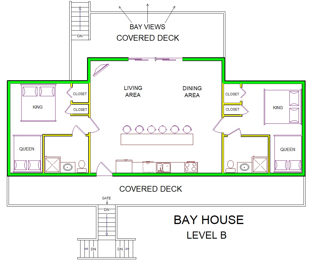Living Room - Internet TV/Bay view; Kitchen - counter seating for 4/Bay view; Dining area - 1 table seating 6/Bay view; 2 Bedrooms: 1 bedroom (1 King, 1 Queen) - en suite full bath/shower only; 1 bedroom (1 King, 1 Queen) - en suite full bath/shower only; picnic table; 2 covered decks
