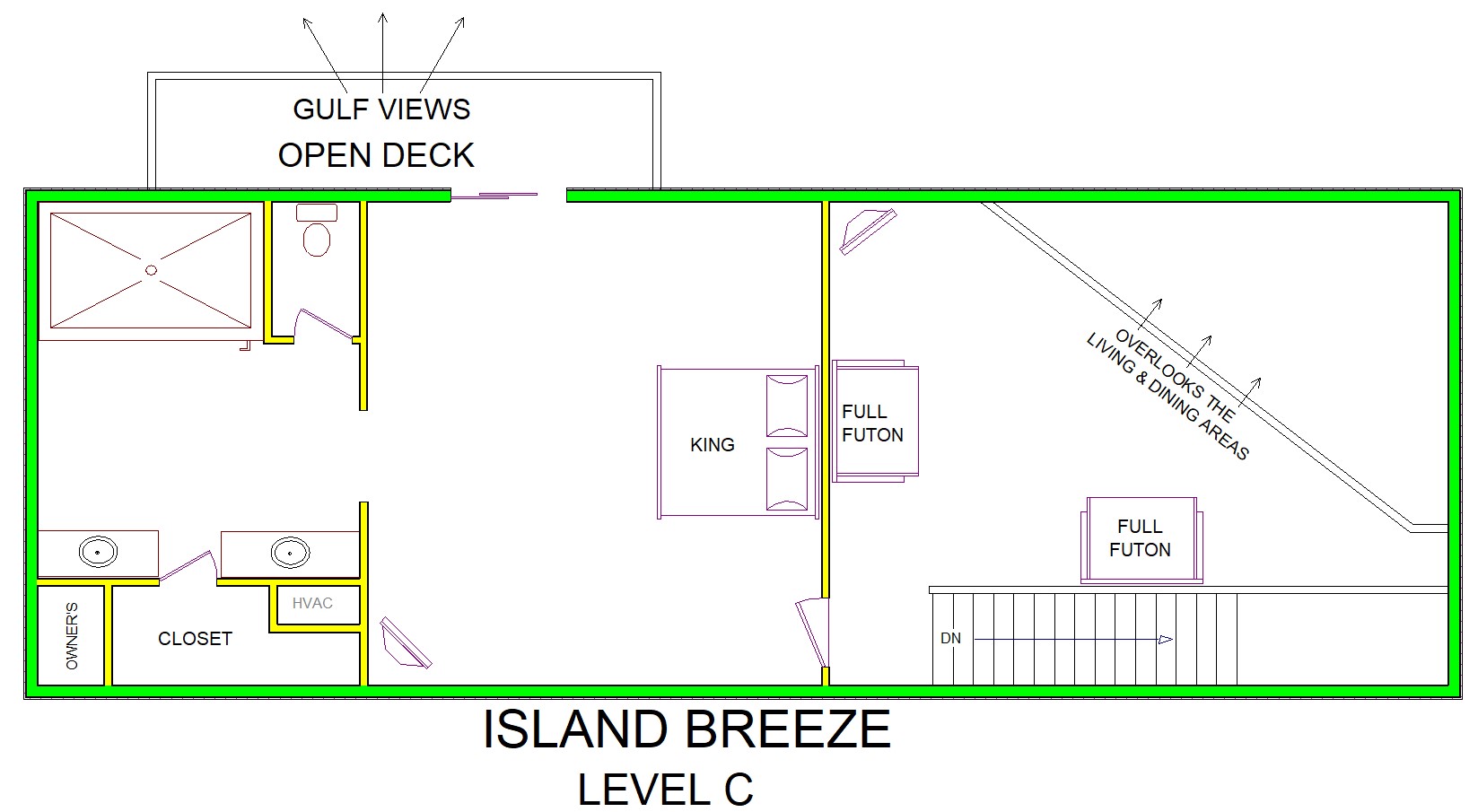 Loft - open to Living Room/TV/DVD/2 futons (Full)/DVD library; Primary Suite (King) - full bath/shower only/double vanity/Gulf view/private deck (uncovered)
